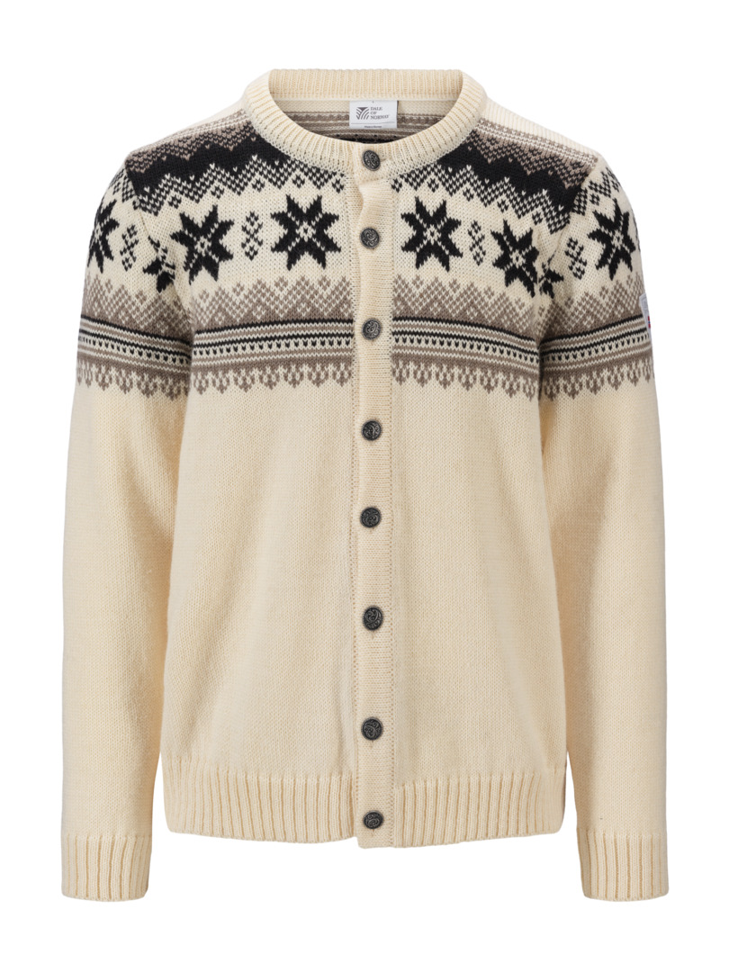 A classic, retro wool jacket with detailed patterns reminiscing back to the 1950s and 60s. The jacket has a front button closure with Norwegian-made pewter buttons. The Veafjord is knitted in 100% long-lasting Norwegian wool, making the wool jacket extra warm and durable.